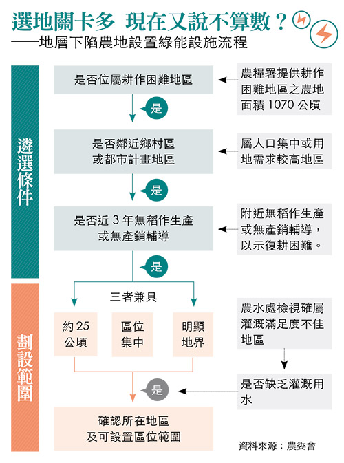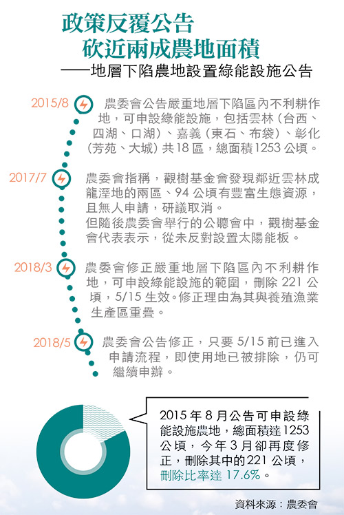 二○一五年,農(nóng)委會(huì)調(diào)查嚴(yán)重地層下陷地區(qū)內(nèi),確實(shí)屬於不利耕作的農(nóng)地,而後修正《申請(qǐng)農(nóng)業(yè)用地作農(nóng)業(yè)設(shè)施容許使用辦法》,限制僅有農(nóng)業(yè)主管機(jī)關(guān)公告的不利耕作農(nóng)地,才能申設(shè)綠能設(shè)施,就為避免推動(dòng)綠能,卻形成「與農(nóng)搶地」的爭(zhēng)議。